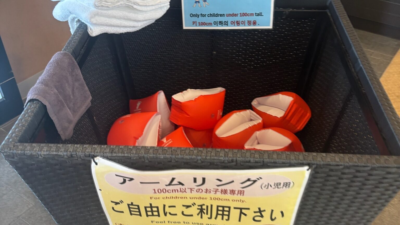 杉乃井ホテルのアクアガーデン、アクアビートでは、子供用アームリングを無料で貸し出しています。